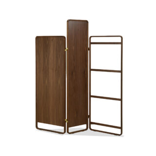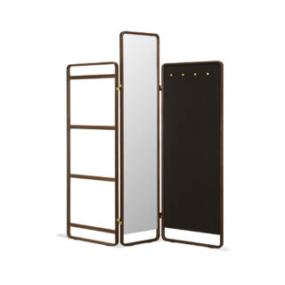 BELVEDERE VANITYスタンドミラーは、BELVEDEREミラーから派生した製品です。ミラー、コートラック、フック仕切りの3つのパーツから構成されています。 連結部の角度を調節することで、空間を区切ることができます。 BELVEDERE VANITYミラーは、異素材の組み合わせで、 精緻な木材と蝶番を組み合わせ、仕切りと鏡枠が本革で包まれており、ユニークなデザインになっています。中央のミラーの高さが特徴的で、 部屋の好きな位置に移動でき、芸術的で美しさと機能性を兼ね備えています。