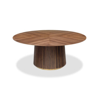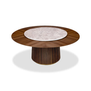 円柱のベースに巻かれた細長い板は、かさばる感を弱くして、1920年代から1930年代にかけて上海の旧フランス租界でよく使われていた曲線の壁パネルのような、伸びやかさを感じさせる視覚的な印象となり、真鍮色の金属リングとともに、歴史的な深い味わいを呈しています。 天板の天然大理石と美しい木目の組み合わせは、ダイニングテーブル全体に強い芸術感を与え、エレガントで美しいです。