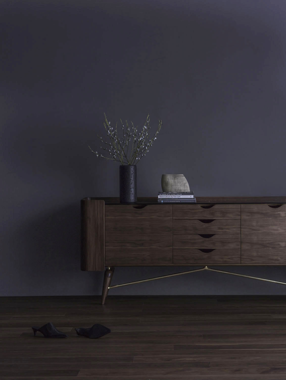 LANGHAMはNoirシリーズの中で最も代表的な作品になります。 木製の三面一体の作りになっていて、まるで馬術騎士のスカートのようです。 この 「騎士のスカート 」のデザインは、Noirシリーズで広く用いられています。 「スカートの両脇には2枚の隠し扉があり、開けると広い収納スペースが現れます。 スカートの木目と引き出しの木目は対照的で、自然の美しさが鮮明に表し、スタイリッシュなデザインになります。