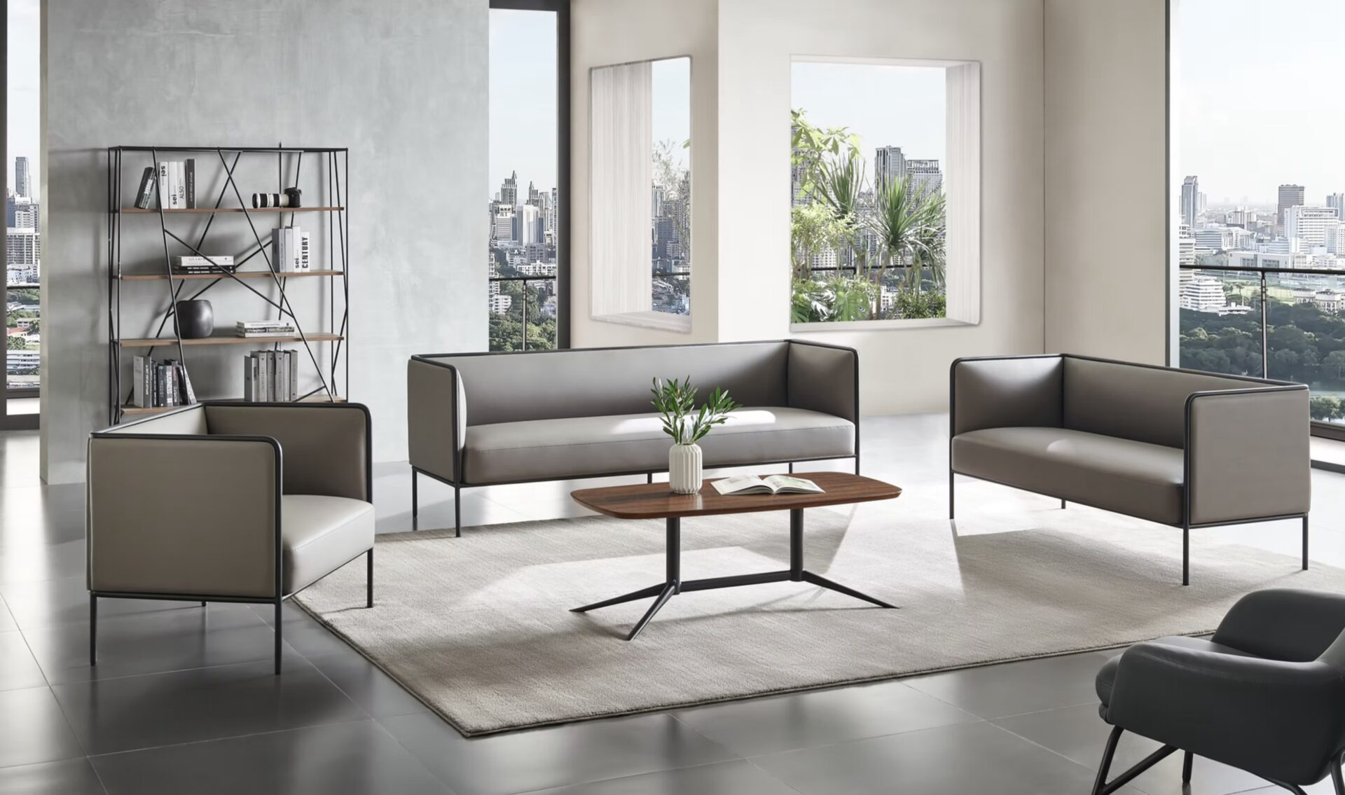 The Max sofa collection is designed for versatile office use, offering various configurations to suit different needs. Its adaptable design allows for numerous variations, ensuring seamless integration into any workspace, from individual lounge chairs to expansive seating arrangements.