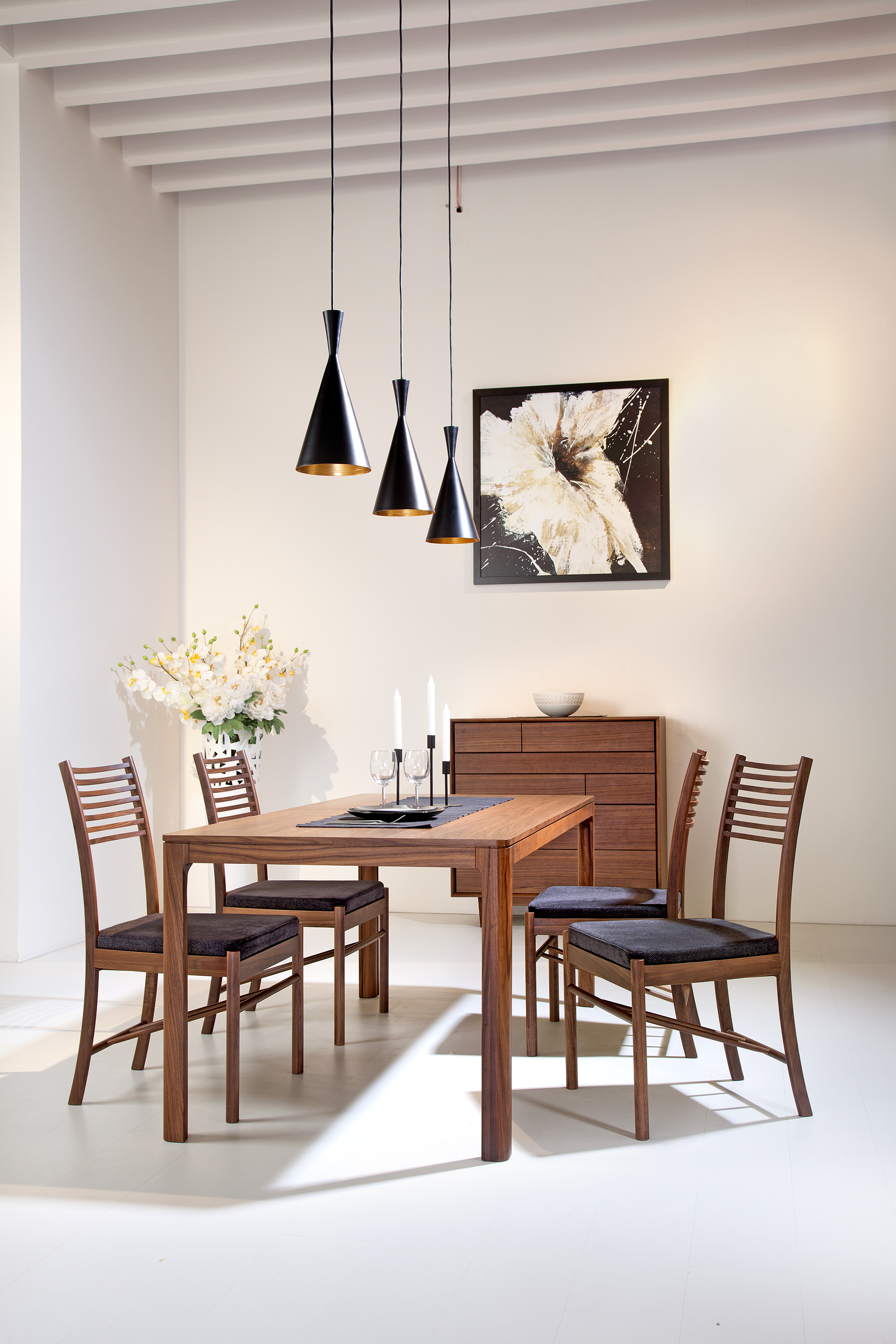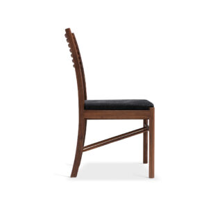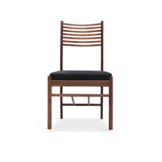 木製フレームに横スラットの背もたれ。真直ぐな前脚と、座面から伸びる曲線の後脚が特徴的なダイニングチェア。腰部と背部にフィットする支持感と、ファブリック/レザー別仕様の座面で、実用性とスタイルを両立します。