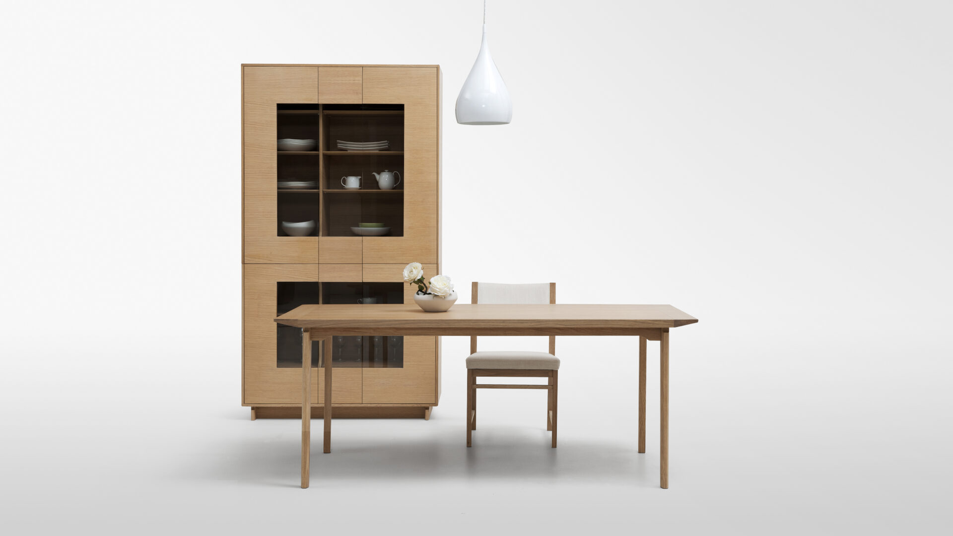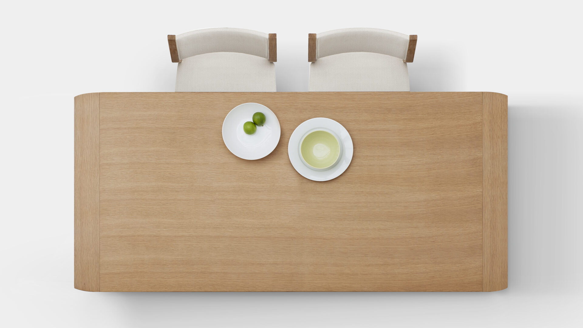 このダイニングテーブルは、スカンディナビアデザインの特徴をしっかりと受け継いでいます。直線と曲線を融合させ、モダンで温もりある美感を形作りました。すべてのエッジは滑らかに面取られ、優しい手触りです。ホワイトオークの無垢材と突き板を組み合わせ、異なる木目が生み出すデザインは、動きのある自然な味わいを演出します。