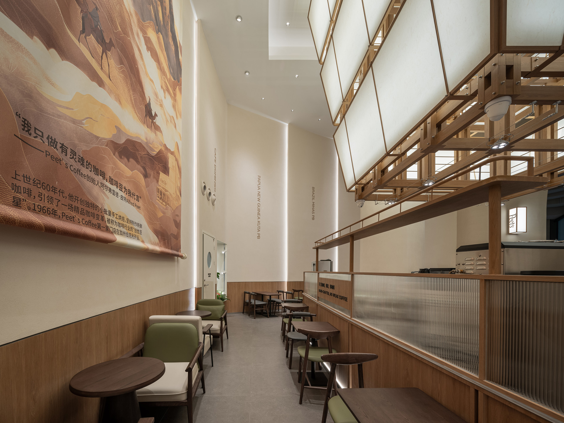 中国西安市のショッピングモール・萬象城に位置するPeet's Coffee CCBD 店は、モダンなデザイン言語を用いて盛唐時代の灯火のイメージを再構築しています。巨大なランタンアートインスタレーションが空間の中央に浮かび上がり、西安が「十三王朝の古都」としての歴史的風景に呼応しています。Mexarts Contract は、カスタマイズされた家具ソリューションを通じて、コンセプト提案、製品開発から生産・納品、アフターサービスまで、Peet's Coffee さまにワンストップの製品サービスを提供しています。